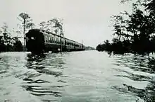The Mobile waterfront was subjected to a storm surge of 11.6 ft (3.5 m), which still stands as the second-highest in the state's history, just short of the record set in Gulf Shores by the 1906 Mississippi hurricane, and the highest ever recorded at Mobile.[24] The tides severely flooded Mobile's business district up to four blocks inland, and it took until the late afternoon of July 6 for floodwaters to recede.[7] Some streets were submerged to a depth of up to 10 ft (3.0 m), and many residents fled to the Battle House Hotel on relatively higher ground.[25] Ultimately, waters still reached the hotel, flooding its lobby to a depth of just over 1 ft (30 cm).[26] In advance of the storm, most wholesale merchants stacked their goods above the high water mark of the 1906 hurricane, but this proved inadequate; tides locally ran nearly 2 ft (60 cm) higher than in 1906, ruining merchandise closest to the ground at a cost of around $500,000.[7] Many miles of railroads were covered by floodwaters and debris,[23] and the tidal action ravaged wharves.[7] At a Mobile and Ohio Railroad cargo storage shed, approximately 11,000 bales of cotton were washed away.[27]
