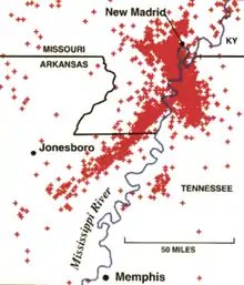 Seismicity in the south–central United States is moderately powerful. The energy from a mid-continent earthquake extends over as much as ten times the area of a similarly sized earthquake in the western United States. A magnitude 4.0 earthquake west of the Rocky Mountains reaches up to 60 miles (97 km) from its epicenter, while a magnitude 5.5 earthquake in the eastern US can be felt 300 miles (483 km) from its epicenter.[2] Science failed to explain the phenomena until 1978, when geologists discovered a massive fault line running from the middle of the continent to its eastern coast. More recent magnetic surveys show that the structure is a 500-million year-old strike-slip fault, which starts under the Eastern Tennessee Seismic Zone and runs to the eastern coast. This corresponds to the strike-slip faulting exhibited in the Eastern Tennessee Zone, and explains the presence of mid-continent earthquakes in the United States. Still, it is not clear if the fault is definitely related to mid-continental seismicity.[3]