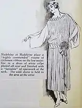 Paris set the fashion trends for Europe and North America.[4] The fashion for women was all about letting loose. Women wore dresses all day, every day. Day dresses had a drop waist, which was a belt around the low waist or hip and a skirt that hung anywhere from the ankle on up to the knee, never above. Daywear had sleeves (long to mid-bicep) and a skirt that was straight, pleated, hank hem, or tiered. Hair was often bobbed, giving a boyish look.[5]