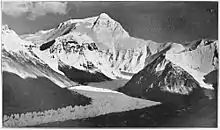- ↑ A footnote to Bullock's diary says it was called "Mary" by Mallory and Bullock but this was later disallowed and that W. H. Murray called it "Ri-Ring".[31] However, Davis says Mallory wanted to call it "Mount Kellas" and states its "true elevation" as 22,520 feet (6,860 m) – the second highest mountain climbed at that time.[32] The 1988 National Geographic map marks an unnamed peak at 28°05′24″N 86°48′55″E / 28.0901°N 86.8154°E, 6,975 metres (22,884 ft) and this has the same location and topographical setting as the "Ri Ring" marked on Morshead's 1921 expedition map.[33] About 2.5 km NE of here the National Geographic map (and Google Maps) marks "Shuguang Peak" at 28°06′32″N 86°49′48″E / 28.1090°N 86.8300°E, 6,622 metres (21,726 ft) and other lists give "Hongxing Ri" at this location while saying it is also called "Ri Ring".