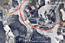 From Tingri, several valleys could be followed south towards Everest and on 23 June Mallory and Bullock started off to the south with sixteen Sherpas and porters.[25] Two days later, at Chobuk they reached the foot of the Rongbuk valley and were then able to see Everest.[25] Ten miles further was the snout of the Rongbuk Glacier[lower-alpha 2] near where they pitched base camp at 5,000 metres (16,500 ft), just beyond the Rongbuk Monastery (Mallory called it "Chöyling"[13]).[26] Only familiar with Alpine glaciers, they had difficulty negotiating 15-metre (50 ft) seracs and retired back at 5,600 metres (18,500 ft) where the West Rongbuk Glacier debouches.[27] Note: the glaciers have lowered and retreated considerably since that time.[28]