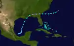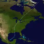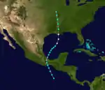 A tropical wave developed into a tropical storm in the eastern Pacific basin by October 12.[4] Initially located about 340 mi (545 km) southwest of San Salvador, El Salvador, the cyclone moved north-northwestward and made landfall near Salina Cruz, Oaxaca, early on the following day. The storm quickly weakened to a tropical depression later on October 13, but remained a tropical cyclone while crossing Mexico and reached the Gulf of Mexico on October 14.[2] At the time, it was the third tropical storm to cross from the eastern Pacific basin to the Atlantic basin; it is one of only five to have done so in recorded history.[9] Curving northeastward, the system soon re-strengthened into a tropical storm. Late on October 15, the storm reached hurricane intensity and peaked with winds of 80 mph (130 km/h) early the next day. Around 06:00 UTC, the hurricane made landfall near Cocodrie, Louisiana, at the same intensity. The system weakened to a tropical storm about six hours later. Now moving quickly north-northwestward, the storm fell to tropical depression status on October 17 and dissipated over Missouri shortly thereafter.[2]