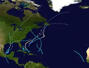 The 1923 Atlantic hurricane season featured 11 tropical cyclones, 9 of which intensified into tropical storms, the most since 1916. Four of the tropical storms intensified into hurricanes, one of which reached major hurricane intensity—Category 3 or higher on the modern-day Saffir–Simpson hurricane wind scale.[1] No tropical storms or hurricanes formed in or entered the Caribbean Sea.[2] The first known system, a tropical depression, formed on June 19, while the last known system, a tropical storm, transitioned into an extratropical cyclone on October 26. A total of Additionally, an October tropical depression was previously recognized as a tropical storm until reanalysis in 2009, while the first and third tropical storms were added to the Atlantic hurricane database that year. The sixth, seven, and eight storms as well as the October tropical depression existed simultaneously on October 16.