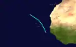 Early on September 7, a tropical depression developed over the far eastern Atlantic about 225 mi (360 km) southwest of Banjul, The Gambia. The depression moved north-northwest and intensified into a tropical storm later that day. Around 12:00 UTC on September 8, the cyclone peaked with maximum sustained winds of 50 mph (85 km/h). The storm then curved northwestward early the next day. Late on September 10, the system weakened to a tropical depression and then dissipated at 00:00 UTC on September 11 while situated about 410 mi (660 km) northwest of Santo Antão in the Cabo Verde Islands.[2] This system was not entered into the Atlantic hurricane best track until reanalysis of the season in 2009.[4]
