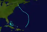 Around August 31, a low-pressure area formed along the tail end of a cold front extending from the Bahamas to Bermuda.[4] Early on the following day, a tropical depression developed roughly 510 mi (820 km) east-southeast of Jacksonville, Florida.[2] The depression moved slowly east-northeastward as the cold front dissipated.[4][2] Late on September 3, the system intensified into a tropical storm, and the next day the cyclone passed northwest of Bermuda.[2] Based on observations from the S.S. Evergreen City, the small storm likely reached Category 1 hurricane intensity early on September 5.[4] The cyclone continued to strengthen, reaching Category 2 intensity on September 6 while drifting northward and then peaking with maximum sustained winds of 105 mph (165 km/h) early the following day. On September 8, the system curved northwestward and weakened to a Category 1 hurricane. The storm then turned north-northeastward on September 9 and transitioned into an extratropical cyclone later that day. The extratropical low continued north-northeastward until dissipating over southern Newfoundland on September 10.[2] Cape Race observed sustained winds of 29 mph (47 km/h).[4]