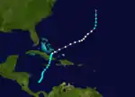 Early on November 5, a tropical storm formed in the southern Caribbean Sea, while located about 275 miles (443 km) north-northwest of Panama City, Panama.[4] The system moved northward with winds of minimal intensity, and it struck Clarendon Parish, Jamaica on November 7 with 40 mph (64 km/h) sustained winds. Early on November 8, it left the northern coast of the island, and it strengthened prior to making landfall west of Santiago de Cuba on November 9.[4] Later, the cyclone strengthened to a hurricane as it entered the Atlantic Ocean, and it turned northeast over the Turks and Caicos Islands on November 10.[3] The hurricane accelerated while heading away from the Turks and Caicos Islands on November 11. Shortly thereafter, it attained a peak intensity of 80 mph (130 km/h) and maintained Category 1 status until November 13. The system passed east of Bermuda and weakened to a tropical storm on November 14. It quickly became extratropical and was last reported on November 15.[3][4]