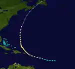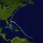 The third tropical cyclone of the season formed 420 miles (680 km) southeast of Bridgetown, Barbados on August 16. It moved northwest and crossed the eastern Caribbean as a minimal tropical storm on August 18. It passed east of San Juan, Puerto Rico and re-entered the Atlantic Ocean on August 9. It quickly strengthened, reaching hurricane status by the following day. The cyclone slowed and turned west on August 21, and it continued to strengthen east of the northern Bahamas. The cyclone strengthened to a peak intensity of 120 mph (190 km/h) north of Grand Bahama on August 24. At the time, the storm was nearly stationary. The cyclone turned sharply north, remaining offshore the East Coast of the United States. On August 25, it quickly weakened, and it passed close to Cape Hatteras on August 26. It transitioned to an extratropical cyclone, before passing over Nova Scotia on August 27.[4]