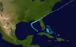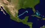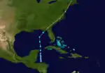 Low pressures were reported in the northwestern Caribbean Sea from September 23 through September 27.[3] On the latter day, a minimal tropical storm formed over the southwestern Caribbean Sea east of Roatán, Honduras. On September 28, the cyclone moved northward and slowly intensified, passing east of Cozumel. On September 29, it entered the southern Gulf of Mexico, attaining its maximum sustained winds of 50 mph (80 km/h) as a tropical system. It quickly accelerated northeast and transitioned to an extratropical system with 60 mph (97 km/h) winds.[4] Later, it entered the Big Bend of Florida near Cedar Key.[3] On September 30, it rapidly moved northeast across the coastal Southeastern United States. It was last detected near Norfolk, Virginia.[4] Storm warnings were released for the eastern Gulf Coast of the United States on September 29, advising residents to prepare for gale-force winds. Warnings were also issued from Jacksonville, Florida, to Fort Monroe, Virginia. Eventually, warnings also encompassed the Mid-Atlantic and Northeastern United States. Gale-force winds affected the East Coast of the United States.[3]