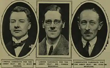 Winston Churchill quickly announced his candidature. He had lost his seat of Dundee in the 1922 general election as a National Liberal follower of David Lloyd George. In 1923 following reconciliation between Lloyd George and H. H. Asquith at the 1923 general election he had stood unsuccessfully as a Liberal candidate in Leicester West. He favoured the restoration of a coalition between Liberals and Unionists. He stood in the Westminster Abbey by-election as a "Constitutionalist" and received unofficial Unionist support. At first it seemed Churchill would be officially supported by the Unionists' local organisation the Westminster Abbey Constitutional Association, but they decided to nominate their own candidate, Otho Nicholson, the nephew of the former member. The Labour Party selected Fenner Brockway. Churchill had hoped that his candidature might have been endorsed by the Abbey Liberal Association or have received the backing of Liberal leader Asquith, but the local Liberals adopted James Scott Duckers. In fact, Abbey Liberals stated that Scott Duckers name would only go forward if Churchill was a candidate.[1] Churchill thus found his candidature opposed by candidates of all three main political parties.