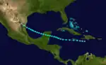 A tropical storm formed on September 1 just south of Hispaniola. Moving just north of due west, the system brushed the south coast of Jamaica as a 40 mph (64 km/h) tropical storm on September 2 before slowly beginning to intensify on September 3. The strengthening tropical storm reached its peak of 60 mph (97 km/h) on September 4 shortly before making landfall on the Yucatan Peninsula near Playa del Carmen near its peak intensity early on September 5. The system deteriorated after crossing the peninsula and entering the Bay of Campeche early on September 6 as a weak tropical storm. Later, the storm restrengthened slightly to winds of 50 mph (80 km/h) while nearing mainland Mexico on September 7. The tropical storm then weakened slightly shortly before making landfall north of Tampico early on September 8 as a weak 40 mph (64 km/h) tropical storm. After moving inland, the system weakened quickly to a depression and dissipated.[4] The storm brought 2.18 in (55 mm) of rain to Brownsville, Texas.[18]