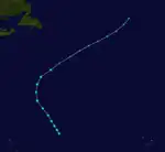 The final cyclone of the season developed about 740 mi (1,190 km) west-northwest of the easternmost islands of Cape Verde on October 10. Moving north-northwest, the system maintained intensity on October 11, before beginning to intensify more rapidly on October 12. Early the next day, it strengthened into a Category 1 hurricane and peaked with maximum sustained winds of 90 mph (140 km/h). After turning northeastward, the hurricane weakened to a tropical storm on October 14. Around 06:00 UTC on October 15, the cyclone transitioned into an extratropical cyclone while situated approximately 285 mi (459 km) northwest of Flores Island in the Azores.[4]