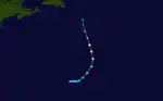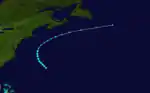 A trough extending southward from the previous system developed into a tropical depression at 12:00 UTC on October 19, while located about 890 mi (1,430 km) east-southeast of Bermuda.[5][2] Moving eastward, the depression intensified into a tropical storm early the next day. Later on October 20, it curved northeastward and accelerated. The storm intensified into a hurricane at 12:00 UTC on October 21. Strengthening further, the hurricane peaked with maximum sustained winds of 80 mph (130 km/h) and a minimum barometric pressure of 997 mbar (29.4 inHg). At 06:00 UTC on October 22, the hurricane became extratropical, while situated about 665 mi (1,070 km) south-southeast of Cape Race, Newfoundland. The remnants moved north-northwestward and dissipated early on October 23.[5]