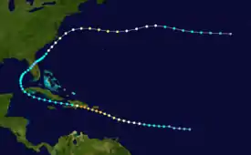 The mountainous terrain of Hispaniola rapidly weakened the hurricane, and by about 12 hours after moving ashore the winds decreased to tropical storm status. It quickly emerged into the Windward Passage and moved westward to the south of the Cuban coastline. On September 6 the storm crossed western Cuba before recurving northeastward into the Gulf of Mexico with winds of 40 mph (64 km/h). It strengthened slightly, moving ashore near Tampa, Florida, with 45 mph (72 km/h) winds. While crossing the state, it weakened to tropical depression status, although it re-intensified after moving into the western Atlantic Ocean. By September 12, it again attained hurricane status to the southeast of the Carolinas. After brushing the Outer Banks of North Carolina with winds of 70 mph (110 km/h), the hurricane turned eastward and reached a secondary peak intensity of 100 mph (160 km/h) to the north of Bermuda. It gradually weakened, deteriorating to tropical storm status on September 16 and dissipating the next day to the west of the Azores. The remnants merged with a system that later affected the Azores and Ireland.[1]