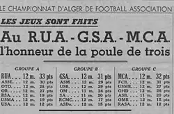 - ↑ 1939–40 Algiers Football League (3rd Round), published in "L'Echo d'Alger", 28th year, N° 10705 dated Monday 27 November 1939, page 3.