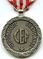 The 1943–1944 Italian campaign medal was a 36mm in diameter silvered bronze medal. Its obverse bore the left profile view of a Gallic rooster in front of Sun rays surrounded by the relief circular inscription "CORPS EXPÉDITIONAIRE FRANÇAIS D'ITALIE * 1943-1944 *" (English: "FRENCH EXPEDITIONARY CORPS OF ITALY * 1943-1944 *") within a relief laurel wreath along the entire medal circumference. On the reverse, within the same relief laurel wreath, the circular inscription "RÉPUBLIQUE FRANÇAISE" (English: "FRENCH REPUBLIC"), at the bottom a relief five pointed star, in the center, the relief inscription "CEF".[2]