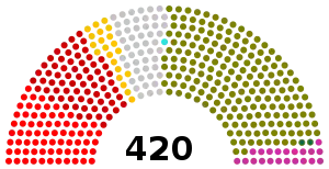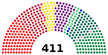 Composition of the National Assembly in June 1947. By the dissolution of Parliament, the Smallholders' original absolute majority of 245 seats had been reduced to a plurality of 187 due to mass Communist arrests of its members and expulsions from the coalition.[2]
