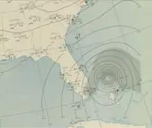 A tropical wave developed into a tropical depression just northeast of Havana, Cuba, late on August 18.[2] The depression briefly moved inland along the north coast of Cuba, before emerging into the Gulf of Mexico early on August 19. At 06:00 UTC, the system intensified into a tropical storm. Shortly thereafter, the cyclone curved northwestward, before turning westward late on August 19. About 24 hours later, the storm curved north-northwestward. At 14:00 UTC on August 22, the system made landfall near Golden Meadow, Louisiana, with winds of 45 mph (75 km/h). However, the cyclone turned southwestward and soon reemerged into the Gulf of Mexico. The storm then curved northwestward on August 23 and finally began to strengthen significantly. At 06:00 UTC on August 24, it intensified into a hurricane. About 12 hours later, the hurricane peaked with maximum sustained winds of 80 mph (130 km/h) and a minimum barometric pressure of 984 mbar (29.1 inHg); the latter was observed on land and was used to estimate the former. The cyclone made landfall in Galveston, Texas, at 22:00 UTC. Moving inland, the system weakened to a tropical storm early on August 25 and to a tropical depression later that day. Thereafter, the depression slowly weakened, until dissipating over Oklahoma on August 27.[4] Operationally, this cyclone was believed to have been two systems, causing the United States Air Force to inadvertently assign it two names – Dog and Easy.[8]
