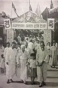 The North Korean government claimed that 78% of eligible voters in South Korea took part in the election of 1,080 people's delegates.[2] The South Korean people's delegates subsequently met on 21–26 August in Northern Haeju, with 1,002 of the 1,080 elected representatives participating. They elected 360 deputies to the Supreme People's Assembly on the basis of one deputy per 50,000 South Koreans.[2]