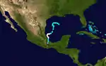 A tropical wave entered the Gulf of Mexico on September 18.[8] It moved northwestward and developed into a tropical storm on September 20, while offshore Louisiana. The storm continued northwestward, then turned to the southwest, and erratically looped to the south on September 22. Steadily strengthening as it tracked south-southwestward, the storm intensified into a hurricane on September 24. After turning to the southwest, it reached its peak intensity on September 25. The hurricane weakened as it turned to the south-southeast then south and fell to tropical storm intensity shortly before making landfall between Veracruz and Nautla. The system dissipated by September 26.[6] Operationally, the storm was treated as two separate storms, due to reconnaissance aircraft being unable to report a center of circulation on September 23.[8] The storm produced 2 to 3 ft (0.61 to 0.91 m) higher than normal tides along the coast of Texas and Louisiana, while its outer rainbands produced locally heavy rainfall.[8]