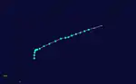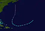 A tropical wave developed into a tropical storm east of Puerto Rico on September 3. It moved northward and strengthened to a hurricane later that day, but then weakened to a strong tropical storm the next day. At the same time, the system halted its forward motion and began to drift eastward. Early on September 5, it re-intensified into a hurricane, and it became a major hurricane on September 6. The storm turned to the north on September 7 and passed about 65 mi (105 km) east of Bermuda on September 8.[8][6] The hurricane weakened as it accelerated northeastward over cooler waters, and became extratropical on September 10 near Atlantic Canada. Shortly after becoming extratropical, it passed over Newfoundland, and ultimately dissipated on September 11 near southwestern Greenland.[8]