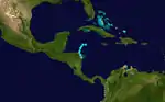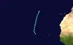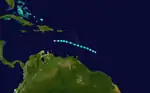 A tropical depression formed to the east of the Lesser Antilles on August 30. It moved steadily west-northwestward,[8] passing over Barbados as a weak tropical storm.[6] Seven people drowned on the island and 27 houses were destroyed in Bridgetown.[9] After entering the Caribbean Sea on September 1, hostile conditions weakened the storm, and the third tropical cyclone of the season degenerated into a tropical wave on September 3 to the south of the eastern tip of the Dominican Republic.[8]
