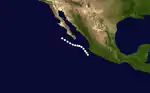 The second tropical cyclone of the season developed 113 mi (182 km) southwest of Manzanillo, Colima on July 3. Similar to Hurricane One, this storm paralleled the coast of Mexico and then headed out to sea. Hurricane Two later headed northwestward, and paralleled Baja California. The hurricane dissipated July 6, 240 mi (386.24 km) north-northwest of Cabo San Lucas.[2]