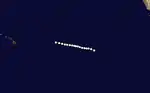 A tropical depression formed over the Central Pacific on August 12, southeast of Hawaii. It tracked west-northwestward, strengthening to become Tropical Storm Hiki the next day (Hawaiian for Able). Hiki reached hurricane strength while a short distance north of the islands. A small hurricane, it paralleled the islands until August 17, when a high pressure system forced the storm southwestward. As the high receded, Hiki moved to the northwest and dissipated on August 21.[3]