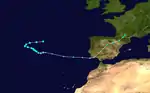 The system moved west-southwestward, atypical for cyclones in that region during September. On September 9, the storm turned to the southeast, reaching estimated peak winds of 50 mph (80 km/h), based on ship observations. Moving slowly through the northern Azores, the storm produced winds of 35 mph (56 km/h) along Terceira Island. It slowly weakened, and by late on September 10 the system degraded into a tropical depression. By the next day, the system was interacting with an approaching cold front, indicating that the depression had transitioned into an extratropical cyclone. Around 20:00 UTC, the storm moved ashore the southwestern tip of Portugal with gale-force winds. The storm turned to the northeast through the Iberian Peninsula, dissipating on September 14 over southwestern France.[12]