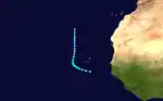 On September 24, a tropical wave moved off the west coast of Africa. It is estimated that a closed circulation developed on the next day, suggesting the formation of a tropical depression. On September 26, the Cape Verdean island of Santiago recorded winds of 30 mph (48 km/h) as the system was passing to the southwest. A minimum pressure of 1,000 mbar (30 inHg) and ship reports of 35 mph (56 km/h) winds indicate that the system reached peak winds of 45 mph (72 km/h), or a minimal tropical storm. It turned to the north on September 27 and likely weakened, although observations were sparse. By September 30, the system lost its circulation and degenerated into an open trough.[12]