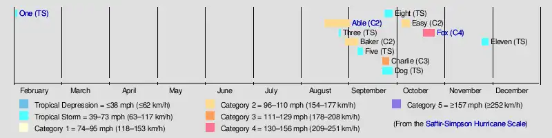 The 1952 Atlantic hurricane season was the last Atlantic hurricane season in which tropical cyclones were named using the Joint Army/Navy Phonetic Alphabet. It was a near normal Atlantic hurricane season, although it was the least active since 1946.[1] The season officially started on June 15;[2] however, a pre-season unnamed storm formed on Groundhog Day, becoming the only storm on record in the month of February. The other six tropical cyclones were named using the Joint Army/Navy Phonetic Alphabet, the first of which formed on August 18. The final storm of the season dissipated on October 28, two and a half weeks before the season officially ended on November 15.[3]