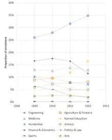The universities were placed under the national economic plans, while the courses which was set to 215 narrowly defined specialisations, which grew to 323 in 1957 in response to manpower need.[18] New colleges majors were created, including geology, mining and metallurgy, electrical engineering, chemical engineering, civil engineering.[10] Meanwhile, as humanities were considered to "be characteristic of bourgeoisie", relevant academic departments and their course offerings were cancelled. The department of sociology at Nanjing University was first merged into the department of politics, which was later closed in 1952. As Zu Qingnian, a Nanjing University professor, complained, after the reorganisation, "the department of philosophy even lost its existence, with young and old scholars all thrown out of the gate of Nanjing University."[20]