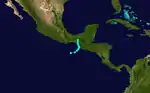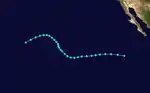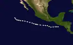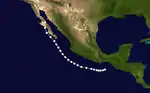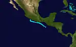 On June 17, an area of low pressure was identified on surface weather maps just off the coast of Guatemala.[5] The following day, the system was classified as a tropical storm approximately 210 mi (340 km) southwest of Guatemala City. Tracking generally northwest, the system acquired maximum sustained winds of 50 mph (85 km/h). On June 20–21, the storm moved parallel to the Mexican coastline before turning north on June 22. It was last noted offshore on this day, approximately 50 mi (85 km) south of Lázaro Cárdenas, Michoacán.[6]