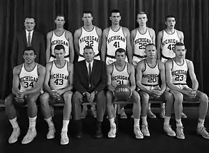 William Perigo was in his eighth and final year as the team's head coach. Junior John Tidwell was the team's leading scorer with 520 points in 24 games for an average of 21.6 points per game.[1] Tidwell broke the Michigan record for single game scoring record on February 27, 1960, as he hit 17 of 25 field goals and seven of ten free throws for 41 points in a 72–65 win against Michigan State.[2] Tidwell's 41 points also broke the Yost Fieldhouse record which had been set by Indiana's Don Schlundt with 29 points in 1953.[2] Tidwell also broke the season scoring record with 520 points. At the end of the 1959–60 basketball season, Tidwell was selected as the team's most valuable player and elected captain of the 1960–61 team.[3]