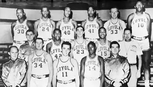 The 1962–63 Loyola Ramblers men's basketball team represented Loyola University Chicago. The head coach was George Ireland. The Ramblers were the 1963 NCAA tournament champions, defeating top-ranked and two-time defending champion Cincinnati Bearcats in a 60–58 overtime contest. The 1962–63 Ramblers were one of the first NCAA men's basketball teams to have broken the so-called "gentlemen's agreement" among coaches in which no more than two black players would be on the floor at one time (and in some road games, black players would have to rotate so that only one of them was playing at any given moment): the Ramblers would regularly have three or four black starters, paving the way for the 1965–66 Texas Western Miners men's basketball team who would finally put the "agreement" to rest and have an all-black starting five.[1][2] They played in the Game of Change, in which a Mississippi State team defied segregationists to play against Loyola, breaking the unwritten law that Mississippi teams would not play against black players.