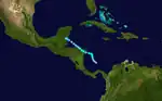 An area of disturbed weather within the ITCZ developed into a tropical depression early on November 5, while located about 135 mi (215 km) north-northwest of Colón, Panama.[3][8]: 187 The depression strengthened slowly, reaching tropical storm status on November 6. Thereafter, it curved westward towards Central America. Early on November 7, the storm made landfall near Puerto Cabezas, Nicaragua, with winds of 70 mph (110 km/h). Several hours later, it weakened to a tropical depression along the north coast of Honduras early on November 8, shortly before re-emerging into the Caribbean. The storm did not re-intensify and made landfall in Belize on November 9. It dissipated early on the following day.[3]