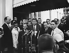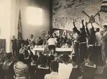 In the Armed Forces, movements of military subordinates such as sergeants and sailors clashed with officers over internal demands, such as the right to run in elections and marriage, and also advocated for reforms.[35] There were organized intellectuals, and some Catholics formed the Popular Action. Students militated in the National Union of Students (UNE). The PCB was well organized and successful in the unions in cooperation with the PTB. Leonel Brizola stood out within the political class, attracted fame with the expropriation of American companies and had many followers.[33] He unified groups in favour of the base reforms into the Popular Mobilization Front and mobilized his political base into the Grupos dos Onze.[36]