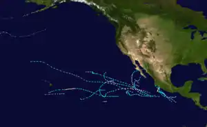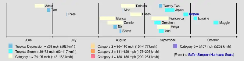 On the morning of June 20, the first tropical depression of the season formed south of Mexico. It initially went west-northwestward. On the afternoon of June 21, the depression strengthened into a tropical storm and was named Adele. It continued north until the evening of June 22, when it strengthened into a category 1 hurricane and sharply recurved west. It made landfall west of Manzanillo, Mexico on the evening of June 24 and dissipated that day. Extensive damage was caused by Adele in Mexico but no deaths were reported. Adele was the shortest lived hurricane of the season.[1]