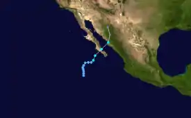 Six days after Joyce dissipated, a new tropical depression formed while southwest of the Baja California Peninsula. This depression, like Joyce before it, took a long time to become named. The depression finally became named storm on September 28 while nearing landfall. Kirsten made landfall during the late morning of September 28 on the Baja California Peninsula. She made another landfall near Los Mochis, Mexico later that day. Kirsten rapidly dissipated over land the next morning. Kirsten caused at least eight deaths in Ciudad Obregón and an estimated damage of $5.6 million (equivalent to $50.51 million in 2022).[10] Despite this, Kirsten was not retired, although the name Kirsten was not used in 1970 due to a possible misspelling. In 1970, the name Kristen was used as a "K" name instead, but in 1974, the "K" name was changed back to Kirsten.