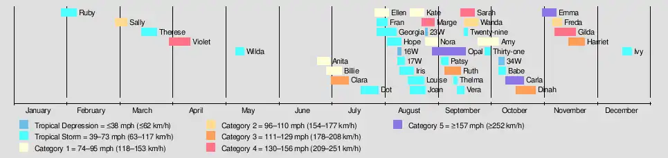 The 1967 Pacific typhoon season was one of the most active Pacific typhoon seasons on record, witnessing the formation of 35 tropical storms during the season. It began on January 1, 1967, though most storms usually form between June and December within the basin. The first storm of the season, Ruby, formed on January 28 west of the Philippines. The scope of this article is limited to the Pacific Ocean, north of the equator and west of the international date line. Storms that form east of the date line and north of the equator are called hurricanes; see 1967 Pacific hurricane season. Tropical depressions that are monitored by the United States' Joint Typhoon Warning Center (JTWC) were given a numerical designation with a "W" suffix, and any storms reaching 1-minute sustained winds of over 40 mph were given a name. Tropical depressions that enter or form in the Philippine area of responsibility are assigned a name by the Philippine Atmospheric, Geophysical and Astronomical Services Administration or PAGASA. This can often result in the same storm having two names.