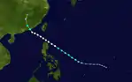 A cold core low developed tropical characteristics and became Tropical Depression 8W on July 6. It tracked westward, becoming a tropical storm later that day and a typhoon on July 7. After briefly weakening to a tropical storm, Clara re-attained typhoon status, and it peaked in intensity on July 10, reaching winds of 115 mph. Clara weakened to a 90 mph typhoon just before hitting Taiwan on the 11th, and it dissipated over China the next day. Clara's heavy rains caused 69 fatalities and a further 32 people to be reported as missing.