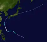 On September 14, Tropical Storm Sarah, which formed across the International Date Line, entered the Western Pacific. Immediately after the first advisory following Sarah's entrance into the West Pacific, it was upgraded to a minimal typhoon. Typhoon Sarah continued to intensify, and late on September 15, it was upgraded to a Category 4 typhoon. The next day, Sarah reached its peak intensity, attaining 150 mph winds and a 932 millibar (mbar) pressure reading (this was the only pressure measurement retrieved from the typhoon), making the system a super typhoon. Sarah began gradually weakening afterwards, and late on September 21, it became extratropical; it was still an 80 mph Category 1 typhoon at the time.