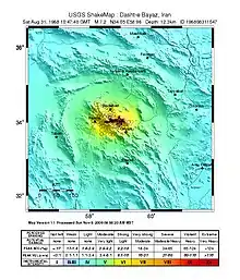 The Dasht-e Bayaz and Ferdows earthquakes occurred in Dashte Bayaz, Kakhk and Ferdows, Iran in late August and early September 1968. The mainshock measured 7.4 on the moment magnitude scale and had a maximum perceived intensity of X (Extreme) on the Mercalli intensity scale. Damage was heavy in the affected areas with thousands of lives lost in the first event and many hundreds more in the second strong event.