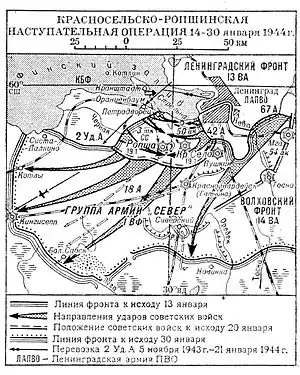 The offensive began on January 14. The final offensive concept required the 2nd Shock and 42nd Armies to penetrate the German defenses along the eastern flank of the bridgehead and near Pulkovo southwest of Leningrad, link up at Ropsha, and encircle and destroy the German forces in the Krasnoye Selo, Ropsha, and Strelna regions. After capturing these initial objectives the two Armies were to advance southwest toward Kingisepp and south toward Krasnogvardeysk. The 108th Corps and the 152nd Tank Brigade were in second echelon of 2nd Shock, and were to strengthen the offensive by attacking toward Krasnoye Selo in case the initial assault failed. Otherwise, it was to initiate a pursuit to the south.[48]