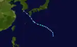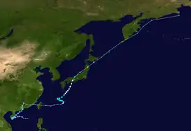 Typhoon Tess was first noted as a closed circulation on 1 September 600 nautical miles east-northeast of Saipan. The storm intensified over the next few days, becoming a typhoon on the 3rd. The cyclone reached its peak intensity on the 4th. Tess then weakened, losing typhoon status on the 8th, and dissipating over the Sea of Irkutsk on the 10th, being absorbed into a frontal system.[3]