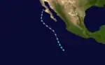 Tropical Storm Glenda formed around 00:00 UTC on September 24 from a previously established area of disturbed weather well southwest of Acapulco.[7] The storm did not intensify beyond minimal tropical storm strength and instead fell to tropical depression strength around 00:00 UTC on September 25.[8] A north to northwestward forward motion brought the cyclone over progressively cooler waters,[7] and it transitioned to an extratropical cyclone by 06:00 UTC on September 27 while located near Punta Eugenia, Baja California Sur.[8]