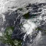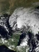 Once again, the storm intensified to near hurricane strength, though Hermine made landfall in Mexico near Coatzacoalcos, Veracruz, on September 24. After moving inland, the storm steadily weakened while tracking south-southwestward toward the Pacific Ocean. However, by early on September 26, Hermine dissipated near the southwestern coast of Mexico.[40] In Mexico, many areas reported at least 10 in (250 mm) of precipitation, while a few locations experienced more than 30 in (760 mm) of rain.[41] As a result of torrential rainfall, at least 30 fatalities occurred, with dozens more missing,[5] and leaving 25,000 homeless.[42] Additionally, landslides triggered by Hermine in Guatemala killed at least eight people.[5]