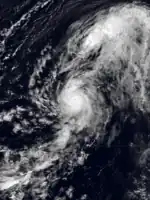 On September 5, satellite imagery suggested a surface circulation had developed, possibly due to interaction with a cold low. As a result, the system regenerated into a subtropical depression at 12:00 UTC on that day, while centered about 360 mi (580 km) southwest of Bermuda.[25][27] Ten hours later, the National Hurricane Center resumed advisories on the subtropical depression.[29] While the subtropical depression was curved northeastward, it strengthened and acquired tropical characteristics. At 00:00 UTC on September 7, the subtropical depression became Tropical Storm Georges.[30] The storm continued to intensify while tracking northeastward and was upgraded to a hurricane about 24 hours after becoming a tropical storm. Simultaneously, Georges attained its peak intensity with winds of 80 mph (130 km/h) and a minimum pressure of 993 mbar (29.3 inHg). However, later on September 8, Georges transitioned into an extratropical cyclone near Cape Race, Newfoundland.[30] While bypassing Newfoundland, Georges dropped light rainfall, with amounts under 1 in (25 mm) of precipitation.[31]