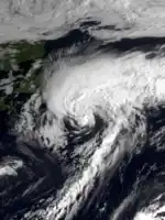 After peak intensity, Frances began to weaken and was downgraded to a Category 2 hurricane later on September 9. Following day, the storm fluctuated between Category 2 and Category 1 hurricane strengthen. While curving northwestward on September 13, Frances remained steady in intensity as a Category 2 hurricane. Eventually, Frances re-curved northward, thereby avoiding any land. After minimal change in intensity, Frances weakened to a Category 1 hurricane while tracking northeastward on September 17. After briefly heading northward, the storm re-curved back to the northeast.[38] Early on September 20, Frances weakened to a tropical storm,[39] before merging with a frontal low while centered about halfway between Greenland and Iceland. Several ships reported tropical storm-force winds, but no impacts occurred on land except for minor squalls in Cape Verde.[35]