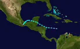 A tropical wave exited the west coast of Africa on September 11 and tracked westward with minimal development until reaching the Caribbean Sea. By September 20, a low-level circulation had developed and the system was then classified as Tropical Depression Eleven, while located almost midway between Panama and Jamaica. While heading almost due westward, the depression steadily intensified, becoming Tropical Storm Hermine on September 21, 18 hours after forming. Later on September 21, the storm passed only 5 mi (10 km) offshore of Honduras. Hermine curved west-northwestward and nearly strengthened into a hurricane before landfall in northern British Honduras (present-day Belize) on September 22. After crossing the Yucatán Peninsula, Hermine emerged into the Bay of Campeche on the following day.[40]