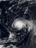 In late September, a cold-core low persisted off the coast of Portugal, moving southwestward. The system gradually developed tropical characteristics as it turned northwestward and executed a loop near the Azores. Eventually, the system organized enough to be designated as a tropical depression on October 4, while just east of the Azores. Shortly thereafter, the depression intensified into Tropical Storm Ivan.[43] However, the National Hurricane Center did not initiate advisories on Ivan until late on October 5.[44] Ivan moved largely in tandem with the upper-level low above it, while its southwest movement was caused by a building ridge to its north.[43] Late on October 5, an eye developed,[45] and Ivan was upgraded to a hurricane on the following day.[43]